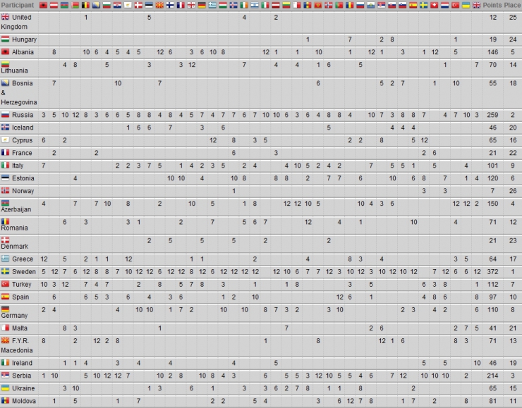 La vittoria della Svezia era matematica già due paesi prima della fine delle votazioni. Secondo posto per “Party for Everybody” delle sei nonnine russe Buranovskiye Babushki, dai 50 ai 76 anni e forno in scena, terzo posto per “Nije ljubav stvar” del serbo Željko Joksimović.
