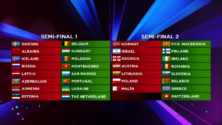 Tre paesi erano sono già stati pre-assegnati prima di oggi: la Svezia gareggerà nella prima semifinale, mentre la Norvegia e l’Israele nella seconda semifinale. La Svezia e la Norvegia, al fine di garantire un’equa ripartizione dei biglietti nella regione nordica e l’Israele, perché il 6 Maggio si festeggia il giorno dell’Indipendenza.